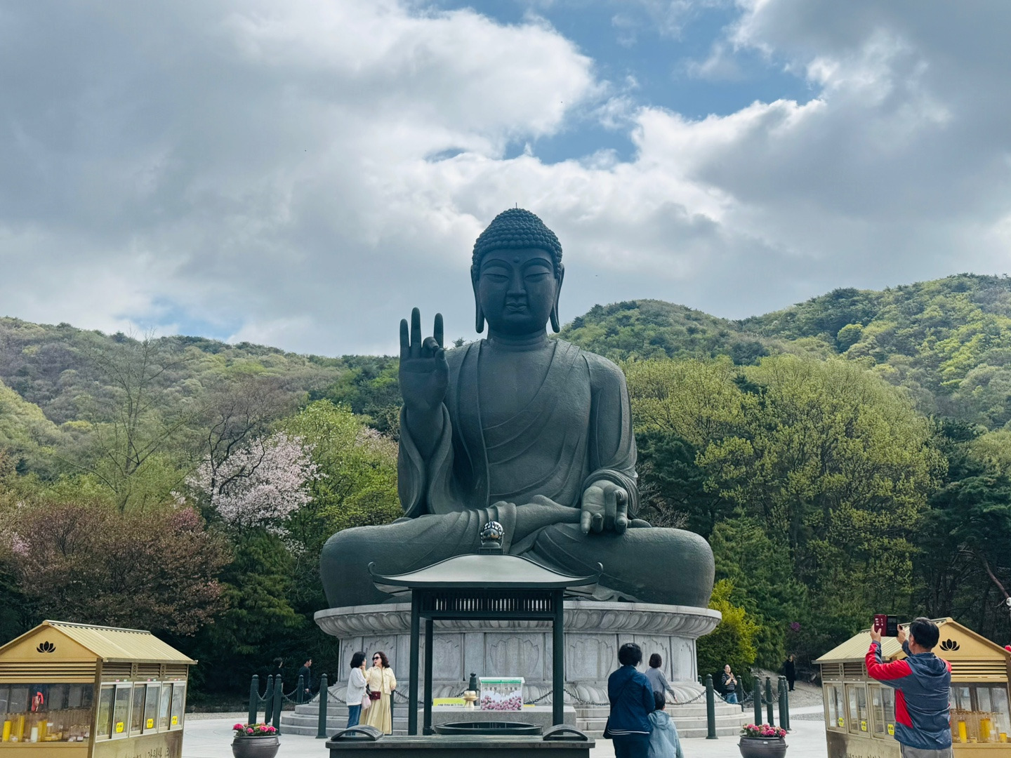 봄이 잠깐 머물다 가고 여름이 성큼 다가온 4월 셋째주 토요일 천안으로 가는 여행~처음 가는 곳이라 기대감 가득한 마음으로 출발했어요. 일반 벚꽃이 지고 난 후 피는 겹벚꽃을 즐기러 오신 분들이 많았어요. 각원사내 여러군데에 겹벚꽃과 수양벚꽃이 절에 고즈넉한 분위기와 너무 잘 어울렸어요. 각원사에는 15미터 높이의 청동대불이 있는데 그 주위에 겹벚꽃괴 청벚꽃 수양벚꽃들이 만개해 화려하게 피어 있었는데 바람이 불 때마다 꽃비가 내리듯이 흐드러지게 떨어져서 이쁘다는 말이 절로 나왔어요. 각원사에서 꽃감상을 다 하고, 아우내 장터 안 병천순대거리에서 피순대의 일종인 순대국밥을 먹고, 아산 봉곡사 천년의 숲길을 걸어가는데 500여년된 소나무들이 하늘 높이 뻗어 산을 이루는걸 보는데 여유로움을 느끼고, 봉곡사라는 작은 절에 고즈넉하고 고요함에 반했어요. 힐링을 제대로 즐기고, 위암 민속마을은 예안 이씨의 집성촌답게 초가집부터 마을 초입에 장승까지 그때 당시 마을의 모습을 즐길 수 있었어요.