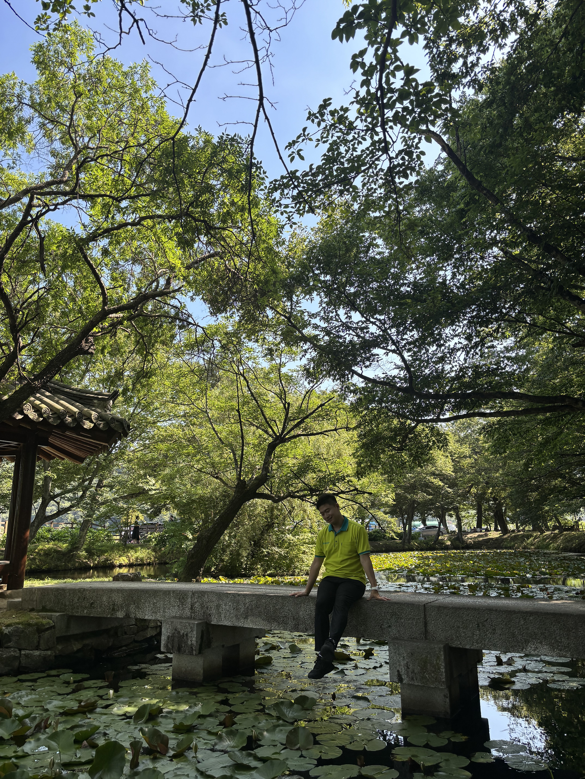 여행의 마지막 코스는 조용한 장산숲. 팽나무들이 하늘을 가릴 정도로 우거져 있고, 숲길을 따라 걷다 보면 한쪽에 고요히 자리한 연못이 눈에 띄었습니다. 바람 한 점 없는 수면 위로 나뭇잎 그림자가 물결처럼 퍼져 있었습니다.