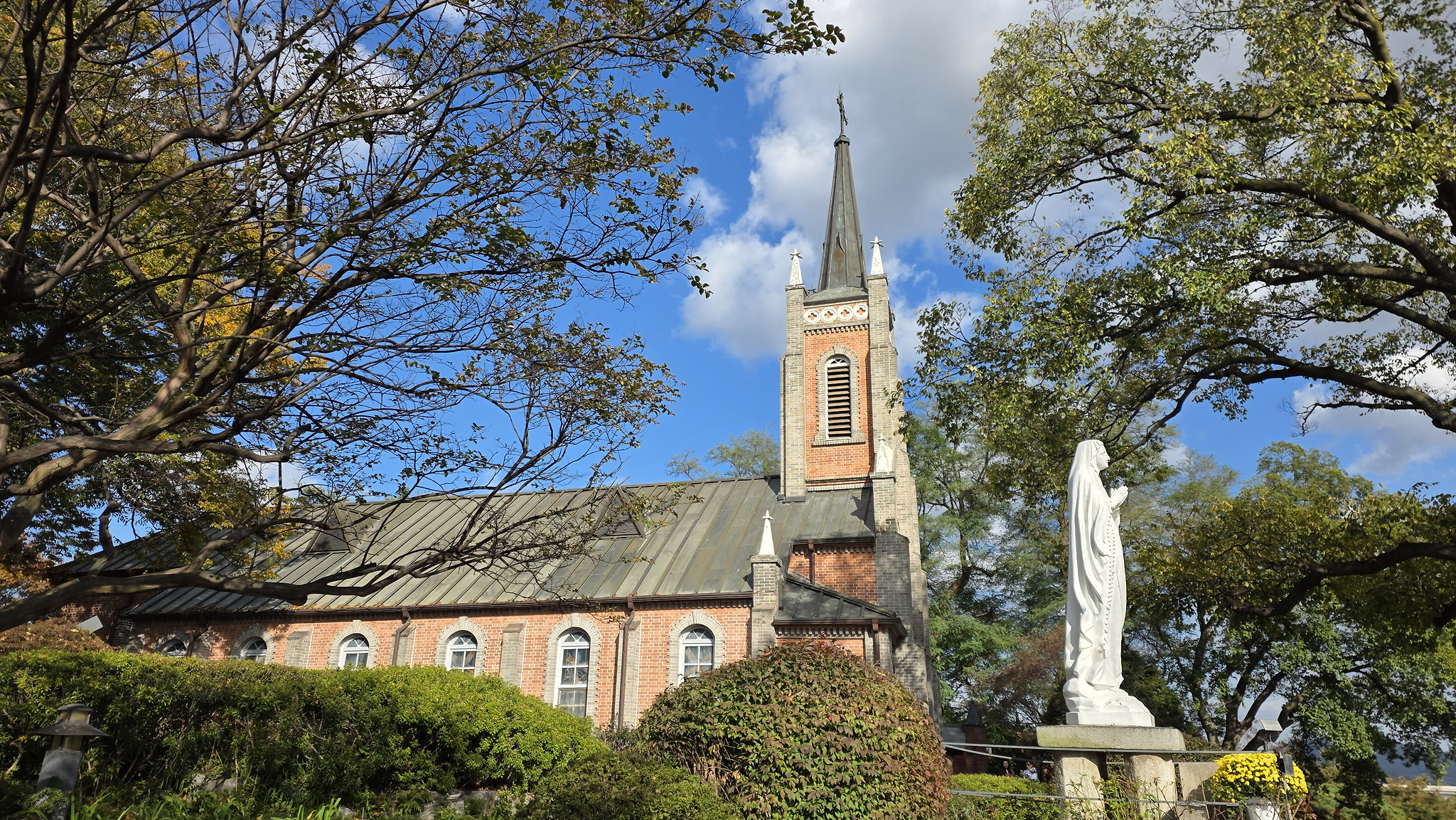 성당 입구부터 오래된 벽돌 건물과 가을 빛이 어우러진 풍경이 정말 아름다웠어요.