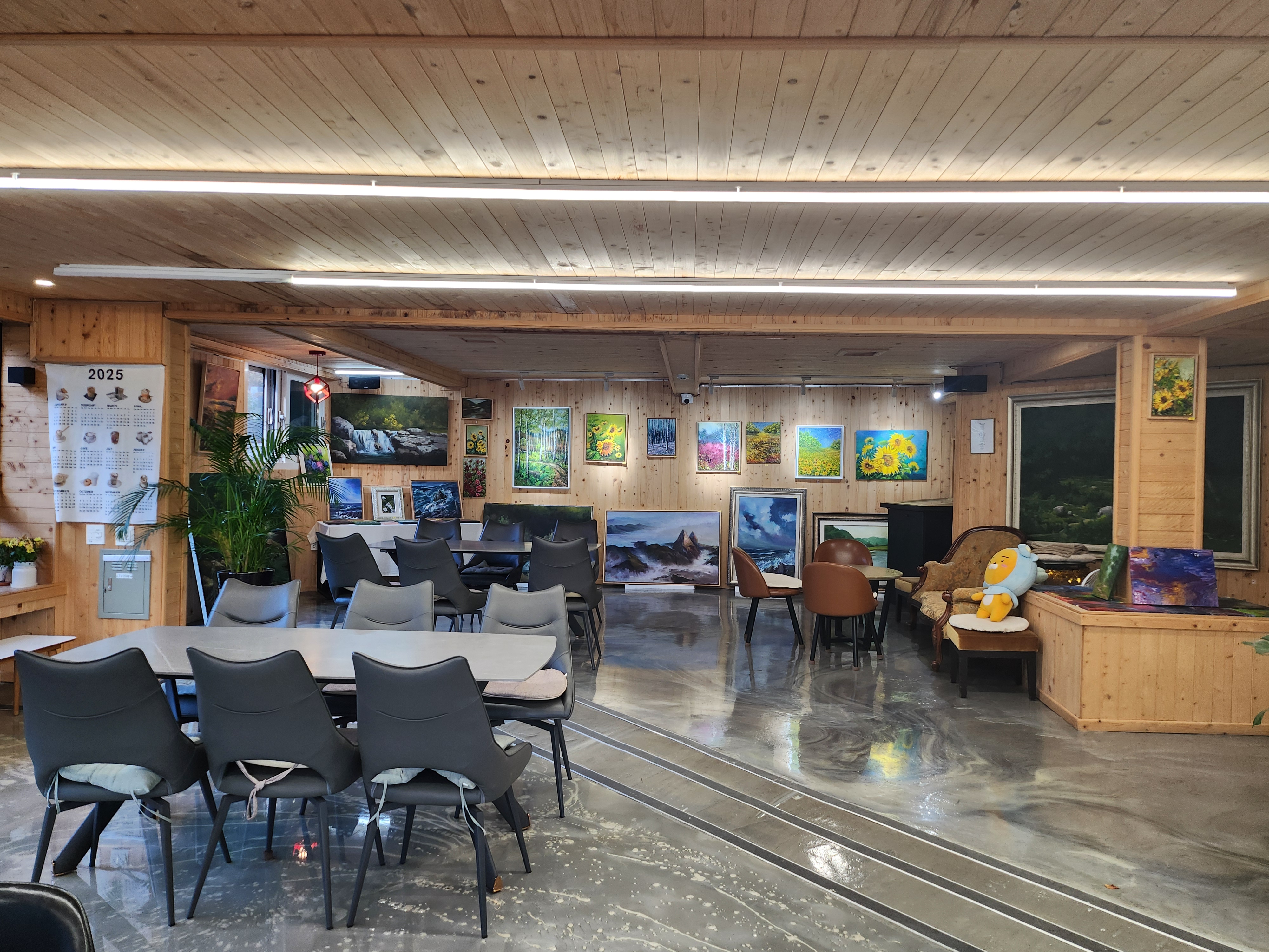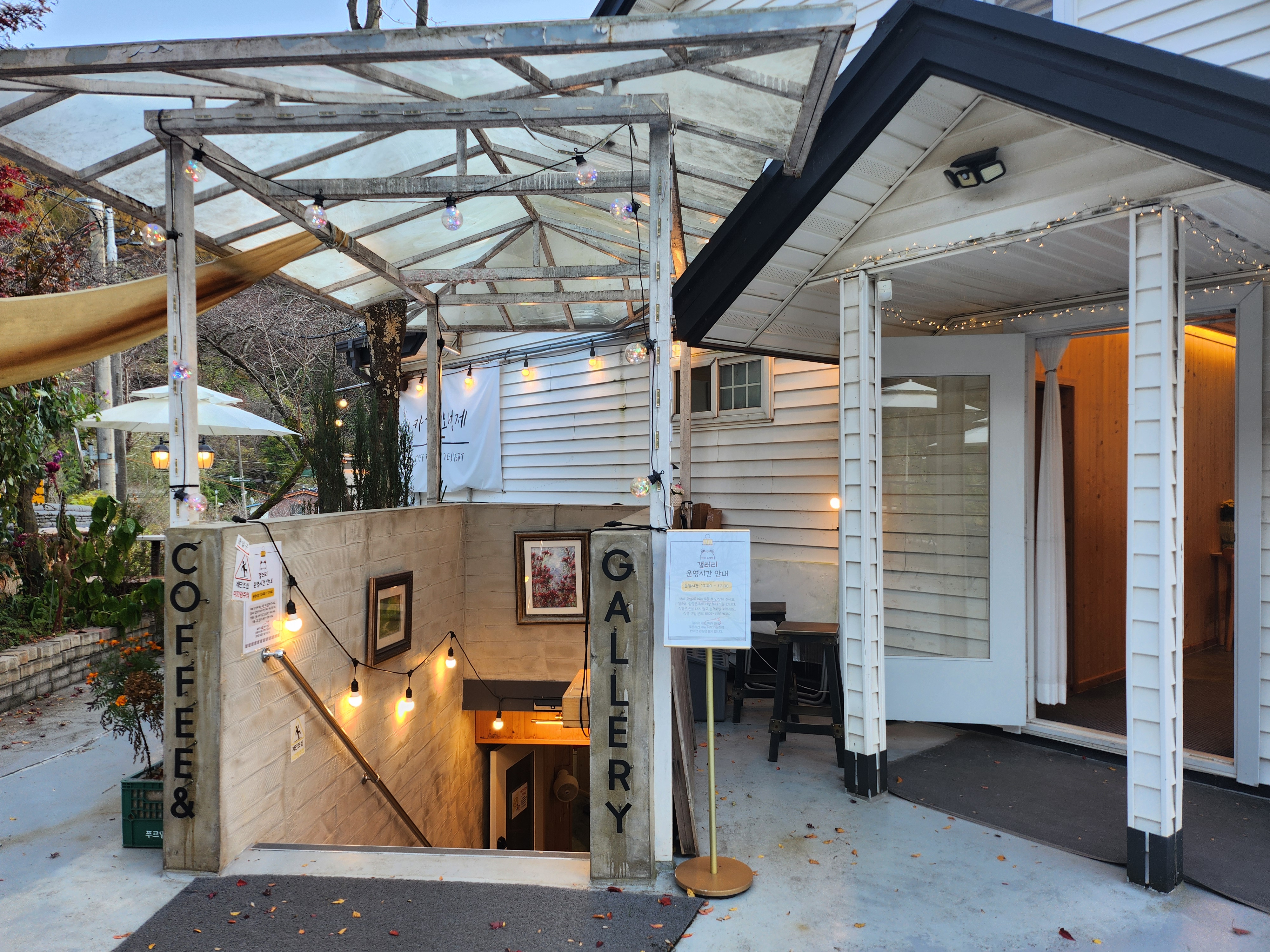예쁜 집 모양의 카페 아래로 내려가면 입체감 있는 그림들이 그려진 갤러리가 있습니다. 카페에는 맛있는 쿠키와 음료수들을 판매하고 있습니다. 커피를 두 잔 마시지 않았으면 커피를 주문했을 텐데 두 잔 마시고 밀크초코를 마시기도 해서 쿠키들과 쌍화차를 주문했습니다.