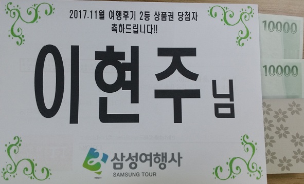 안녕하세요 삼성여행사입니다^^ 11월 여행후기 당첨자입니다. 소리소문 없이 바람이 불고 눈이 오더니 벌써 겨울왔습니다. 겨울은 여름보다 더 축제가 많다는거! 아시나요? 겨울의 시작을 알리는 눈꽃축제, 빛축제 등 올해의 마지막을 장식하는 해맞이까지 여러상품이 준비되어있으니 많은 관심과 문의 부탁드립니다. ★1등 백화점 상품권(3만원) 당첨자: 추미하님 010-9168-**** ★2등 백화점 상품권(2만원) 당첨자: 이현주님 010-3543-**** ★영화권 당첨자 : 총 18 명 ★1등 후기 : http://intra.123tour.co.kr/BBS_2012/View.asp?TB_SEQ=8019&BD_CODE=SS004&Page=1 ★2등 후기 : http://intra.123tour.co.kr/BBS_2012/View.asp?TB_SEQ=7981&BD_CODE=SS004&Page=1 ![]() ![]() 당첨되신 모든 분들 진심으로 축하드립니다. 상품권은 우편등기를 이용해 자택으로 보내드리며 영화표는 여행후기 등록 당시 핸드폰으로 보내드립니다. 감사합니다^^ |