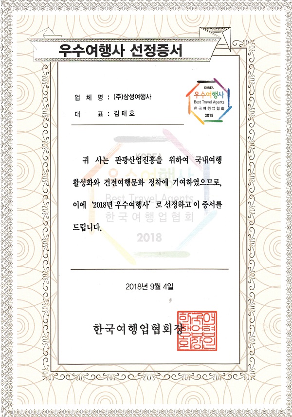 삼성여행사가 전국의 수많은 여행사들 중에 “2018 우수여행사”로 선정이 되었답니다!!!