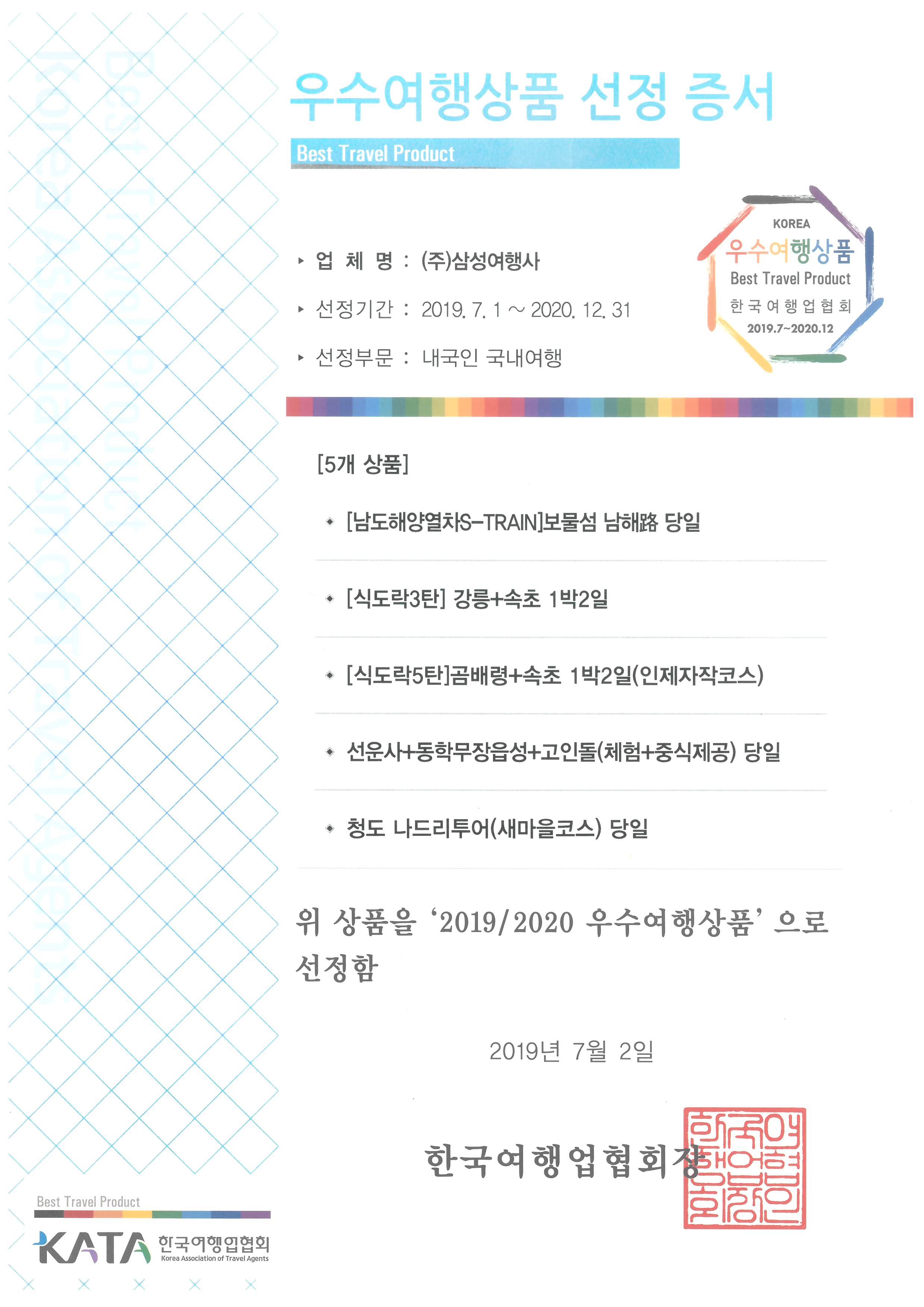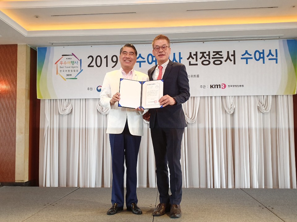 ▶ 2019 우수여행상품 5개여행 선정 ( 4년연속 ) 한국여행업협회(KATA)가 주관하고 문화체육관광부가 후원하는 우수여행상품 인증제도는 국내 최고 권위의 여행상품인증제도로 전문 평가위원회(소비자 관련단체, 관련학회, 여행사대표 등)가 안전성, 독창성, 시장성, 소비자보호, 사회기여도를 중점으로 평가 및 선정하여 건전하고 안전한 여행시장환경 조성에 힘쓰고 고품질, 고부가가치 상품개발을 하는것에 목적을 가지고있는 제도이다.