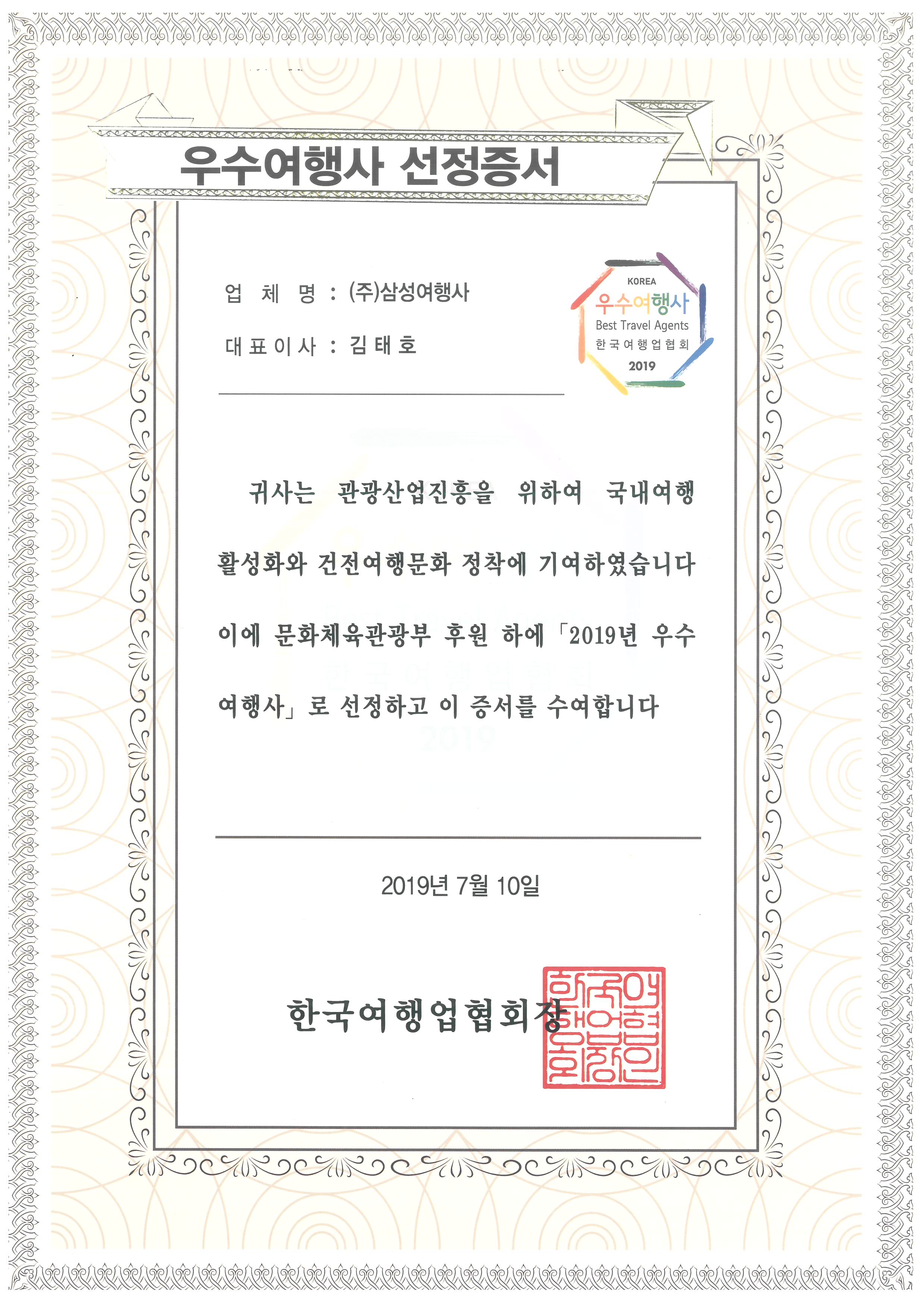 2년연속 2018~2019년 우수여행사