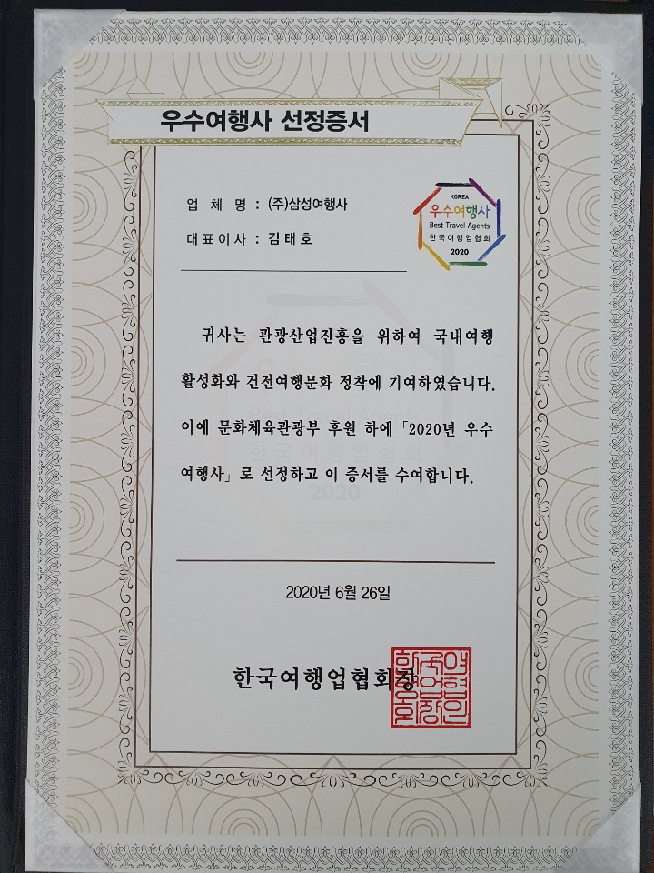 국내 최고 권위의 인증제도로 알려져있는 ------------------------------------------------------------------------------ ▶ 2020 우수여행사 ( 2년연속 ) 한국여행업협회(KATA)가 주관하고 문화체육관광부가 후원하는 ‘2020년 우수여행사 선정’은 매년 관광객 유치실적이 우수하고, 지난 1년간 건전한 영업활동을 수행한 업체를 대상으로 우수여행사로 선정, 지원하여 여행사의 사기진작을 도모하는 제도로 올해 공모는 특히 우수여행사 선정의 신뢰와 객관성을 위해 한국표준협회를 통해 선정평가를 진행하였으며 학계, 유관기관, 소비자단체, 관광업계, 언론 등으로 구성된 평가위원을 구성하여 공정한 심사를 진행하였습니다.