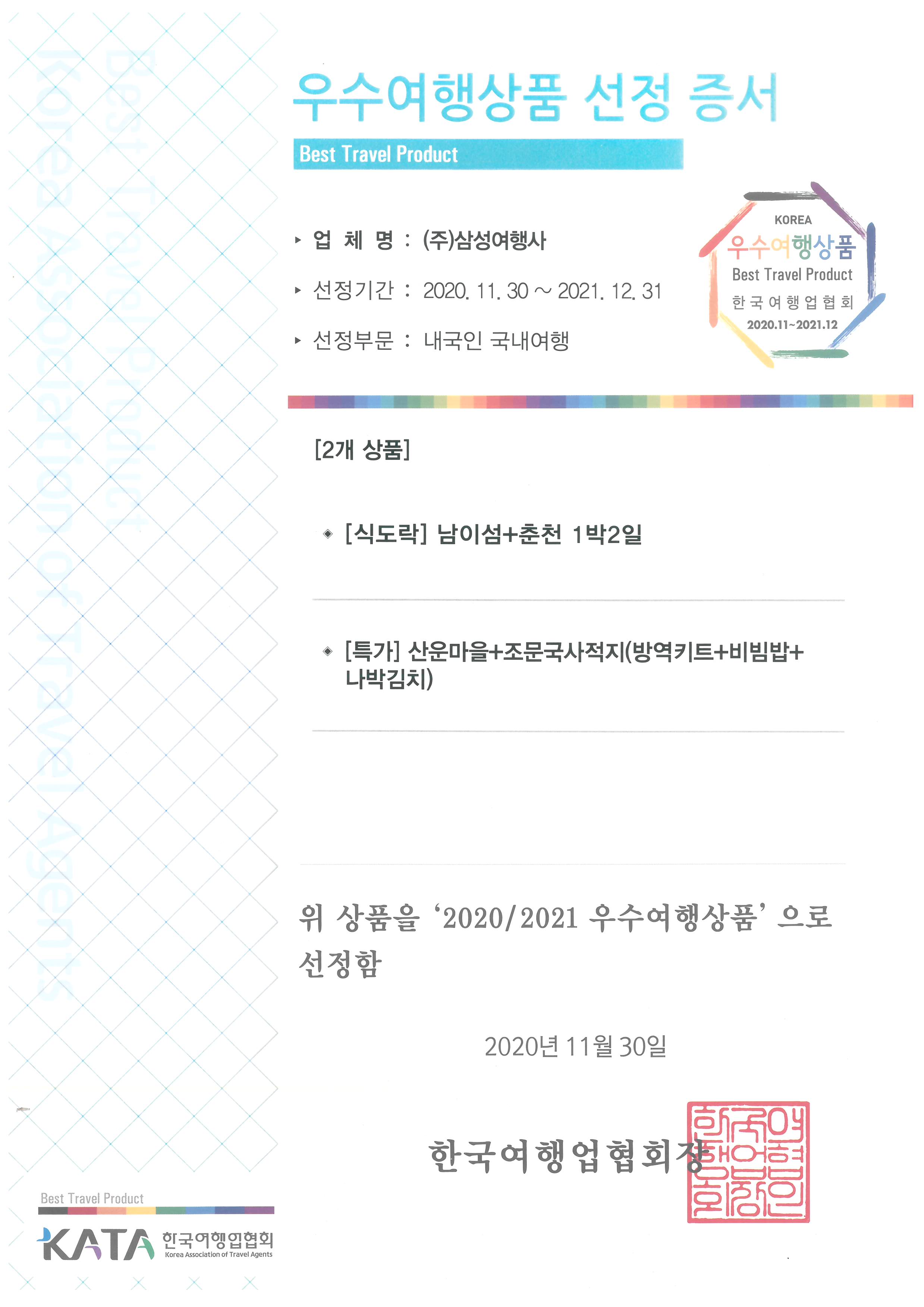 ▶ 2020/21 우수여행상품 2개여행 선정 ( 5년연속 ) 한국여행업협회(KATA)가 주관하고 문화체육관광부가 후원하는 우수여행상품 인증제도는 국내 최고 권위의 여행상품인증제도로 전문 평가위원회(소비자 관련단체, 관련학회, 여행사대표 등)가 안전성, 독창성, 시장성, 소비자보호, 사회기여도를 중점으로 평가 및 선정하여 건전하고 안전한 여행시장환경 조성에 힘쓰고 고품질, 고부가가치 상품개발을 하는것에 목적을 가지고있는 제도이다.